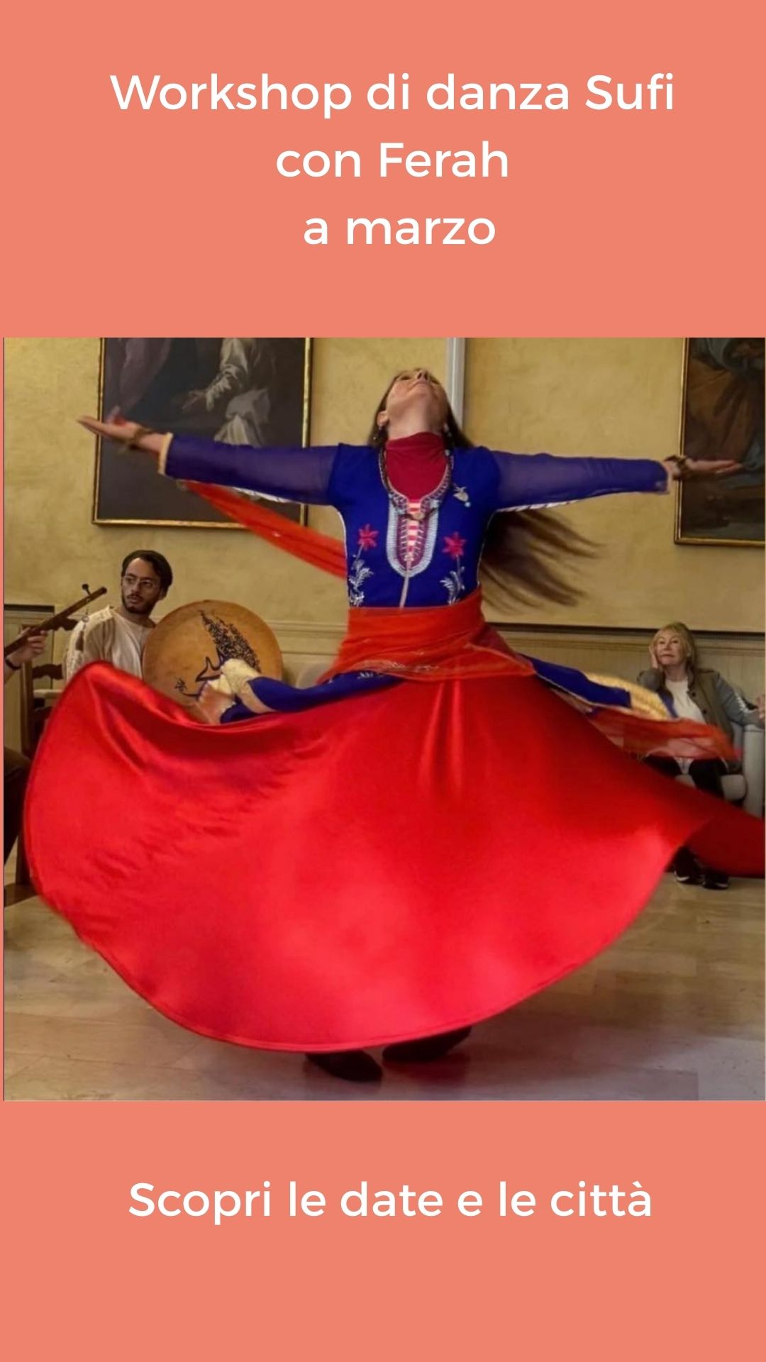La danza dei dervisci rotanti, chiamata in turco Semâ è nata nella confraternita dei Mevlevi fondata nella metà del XIII° secolo dal noto maestro spirituale e poeta mistico Jalāl al-Dīn Moḥammad Rūmī, conosciuto come Mevlana. Mevlana disse: “ci sono tanti sentieri verso il divino, io scelgo la musica e la danza”. il Semâ è un rito in grado di trascinare in uno stato estatico. Questa danza è simbolo dell’ascesa spirituale dell’anima, che realizza un viaggio mistico, che non può essere compreso con la mente, ma può essere sentito con il cuore. Il derviscio, chiamato anche semazen, ruota in senso antiorario ipnotico facendo perno sul piede sinistro, le braccia sono aperte come ali con la mano destra rivolta verso il cielo pronta a ricevere i doni dell’Onnipotente e la sinistra rivolta in direzione della terra, nel gesto di condividere i regali ricevuti da Dio. Il danzatore diventa così un tramite tra la terra e il cielo, il derviscio ha acquisito il significato di “colui che cerca il passaggio”, che porta dal mondo materiale ad un differente mondo spirituale.