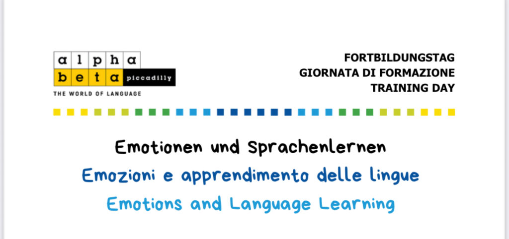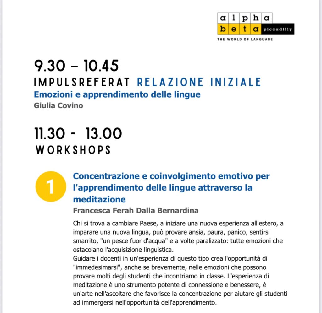 On November 28th, during the Alpha Beta Piccadilly Training Day in Bolzano, dedicated to the theme “Emotions and Language Learning“, I lead the workshop “Concentration and Emotional Engagement for Learning Foreign Languages ​​Through Meditation.